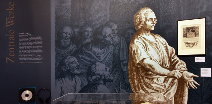 „Das Monster der Selbstentblößung“ (Tagesspiegel), „Der moralische Sprengsatz“ (TAZ) oder „Der edle Wilde“ (Die Zeit), das waren die Überschriften von Artikeln zum 300. Geburtstag von Jean Jacques Rousseau. Erstaunlicherweise wurde Rousseaus Bedeutung in fast allen deutschen Feuilletons gewürdigt, doch in keinem deutschen Museum fand eine Ausstellung statt. Gemeinsam mit den Kuratoren Prof. Dr. Hanno Schmitt und Dr. Silke Siebrecht haben wir den Versuch unternommen, das Unmögliche möglich zu machen und die vielschichtigen Gedanken Rousseaus in einer Ausstellung im Rochow-Museum zu visualisieren.