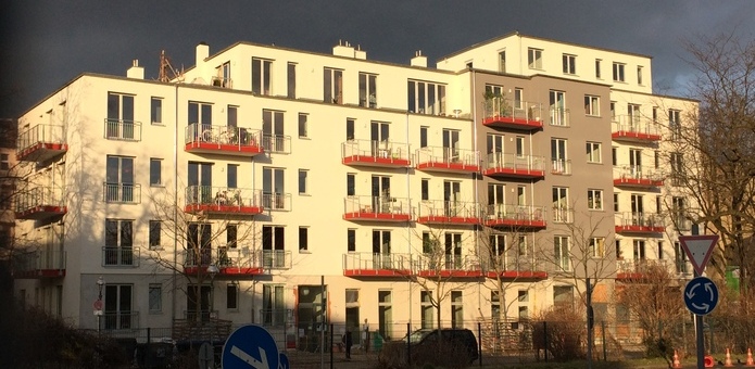 Die Architektur der Wohnanlage mit 42 Wohneinheiten in Berlin Neukölln orientiert sich in seiner gradlinigen Grundausrichtung an der klassischen Modernen. Durch die von uns entwickelte Farbgestaltung werden die beiden glatten Sichtfassaden von 45 und 35m Länge klar gegliedert und strukturiert.