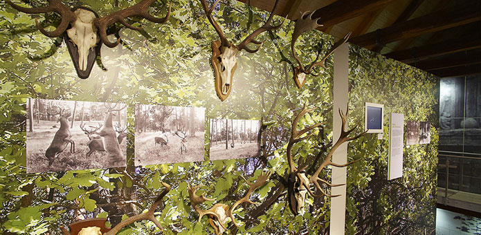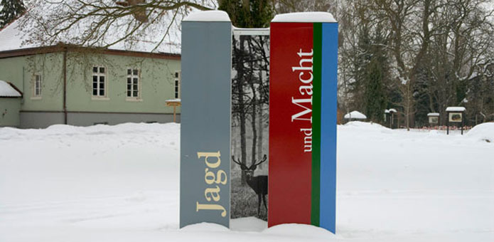 Der Kaiser geht, die Revolution bricht aus und Otto Braun kommt und dann auch Max Schmeling. Die Nazigröße und “Reichsjägermeister” Hermann Göring baut mit Carinhall ein gigantisches Anwesen, um seinen in ganz Europa zusammengeraubten Kunstschätzen einen Raum zu geben. Als die Russen kommen, lässt er es wieder in die Luft sprengen, und Erich Honecker schießt seinen letzten Hirsch am 8. November 1989 um 17 Uhr. Die Verknüpfung dieser Geschichten führt weit weg vom klassischen Jagdmuseum. Trophäen und Jagdwaffen spielen fast keine Rolle. Durch die Ausstellungsinstallationen werden die naturräumliche Kulisse der Schorfheide und die politikgesellschaftliche der nahen Hauptstadt als Gleichzeitigkeit des Ungleichzeitigen erfahrbar gemacht.